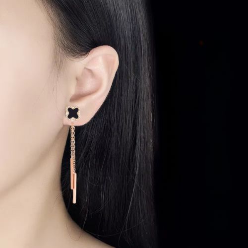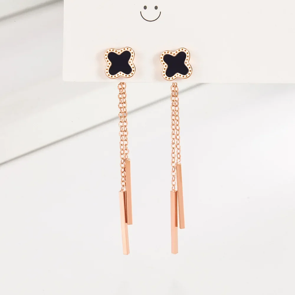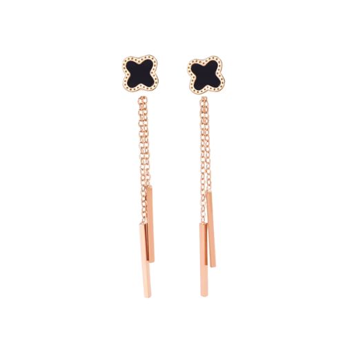 Boucles d’oreilles pendantes trèfle 4 feuilles noir et chaine rose