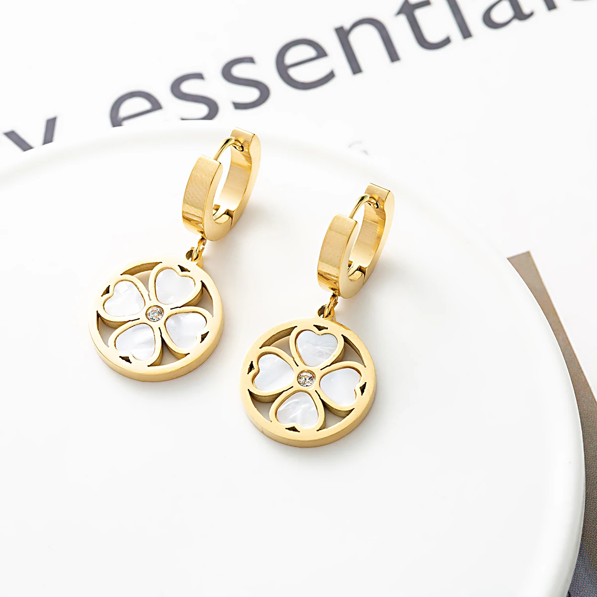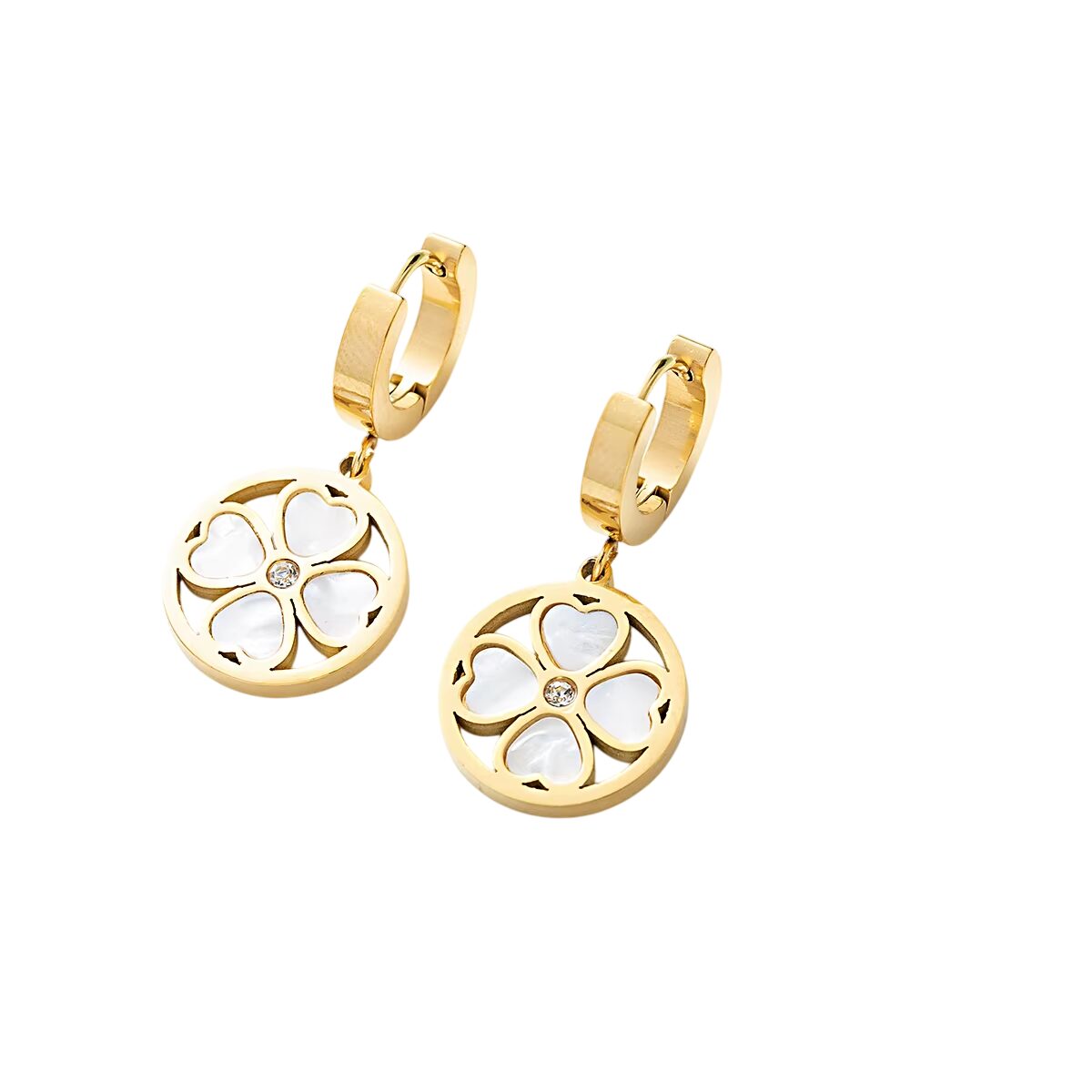 Boucles d’oreilles rondes trèfle 4 feuilles blanc et doré