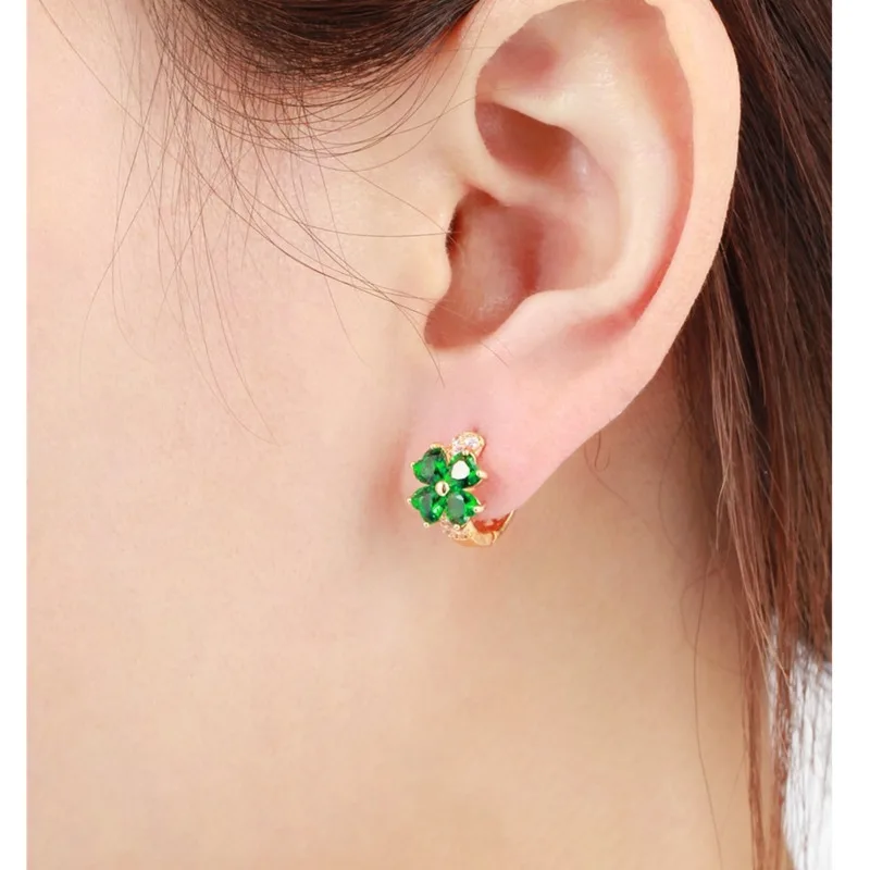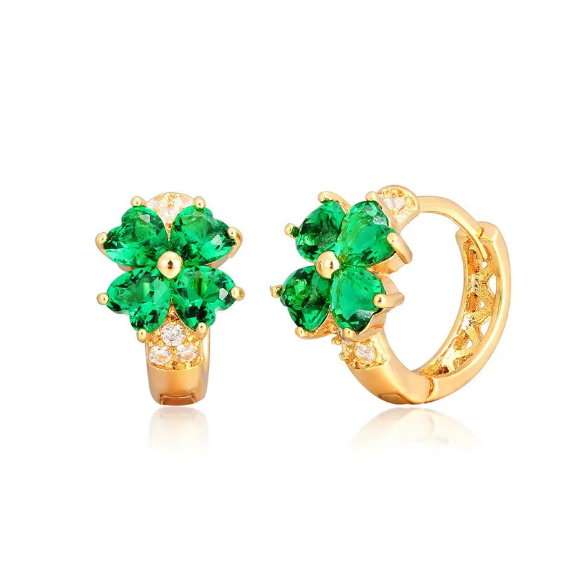 Boucles d’oreilles rondes trèfle 4 feuilles dorées avec cristaux verts