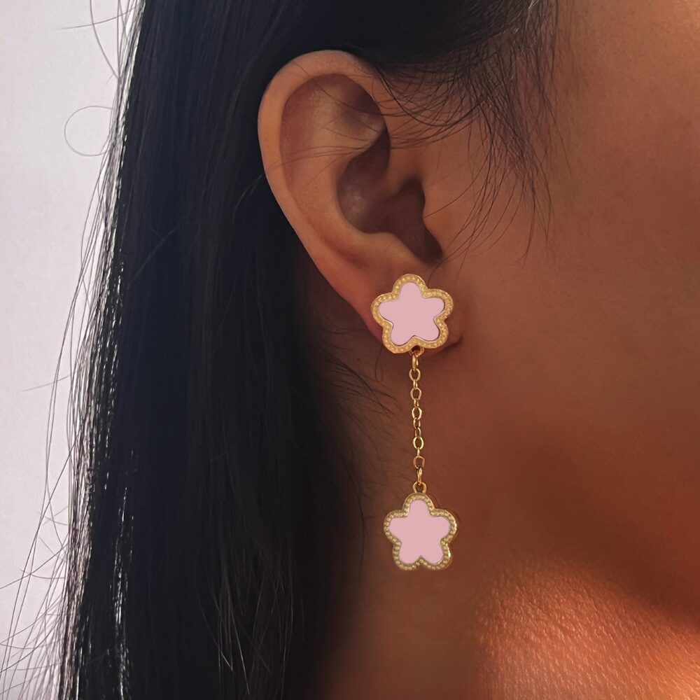 Boucles d’oreilles trèfle pendantes roses et dorées