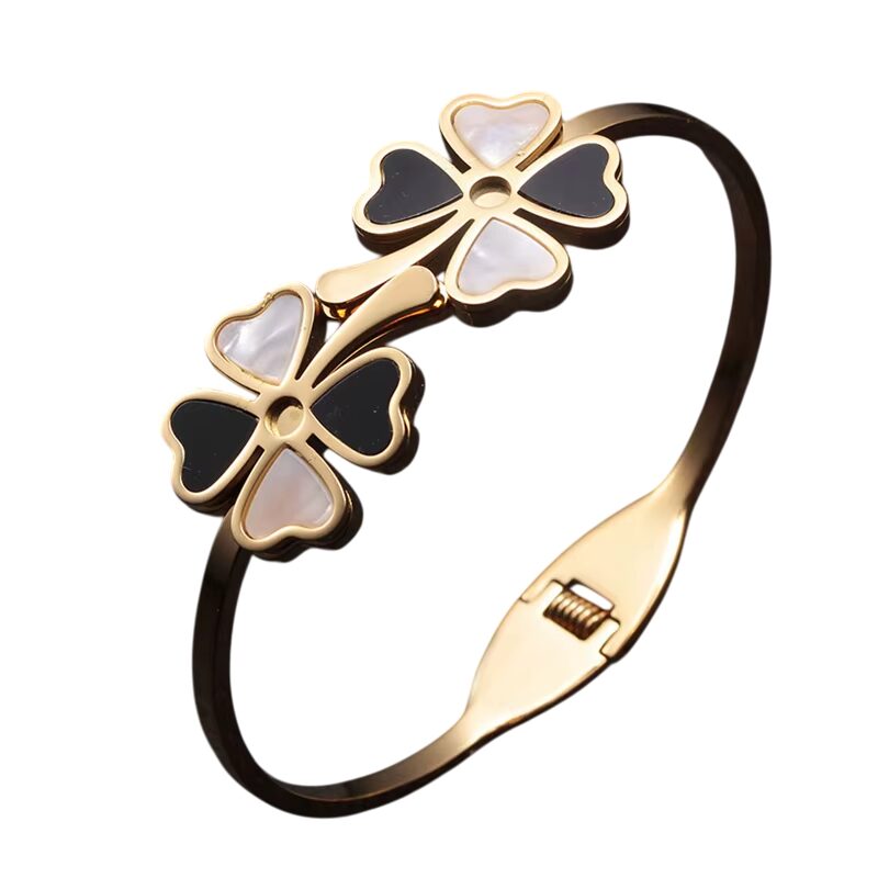 Ajoutez une touche d’élégance à votre collection de bijoux avec notre jonc double trèfle noir et blanc. Ce bracelet en métal de type bangle s’adapte parfaitement aux poignets de 14 à 18 cm. Avec son élégante finition dorée, il apporte une note chic à n’importe quelle tenue. Que vous le portiez seul pour un look minimaliste ou en accumulation pour un style audacieux, ce bijou saura mettre en valeur votre personnalité. Sa **construction en acier inoxydable** lui garantit une durabilité à long terme, tout en étant léger et agréable à porter.